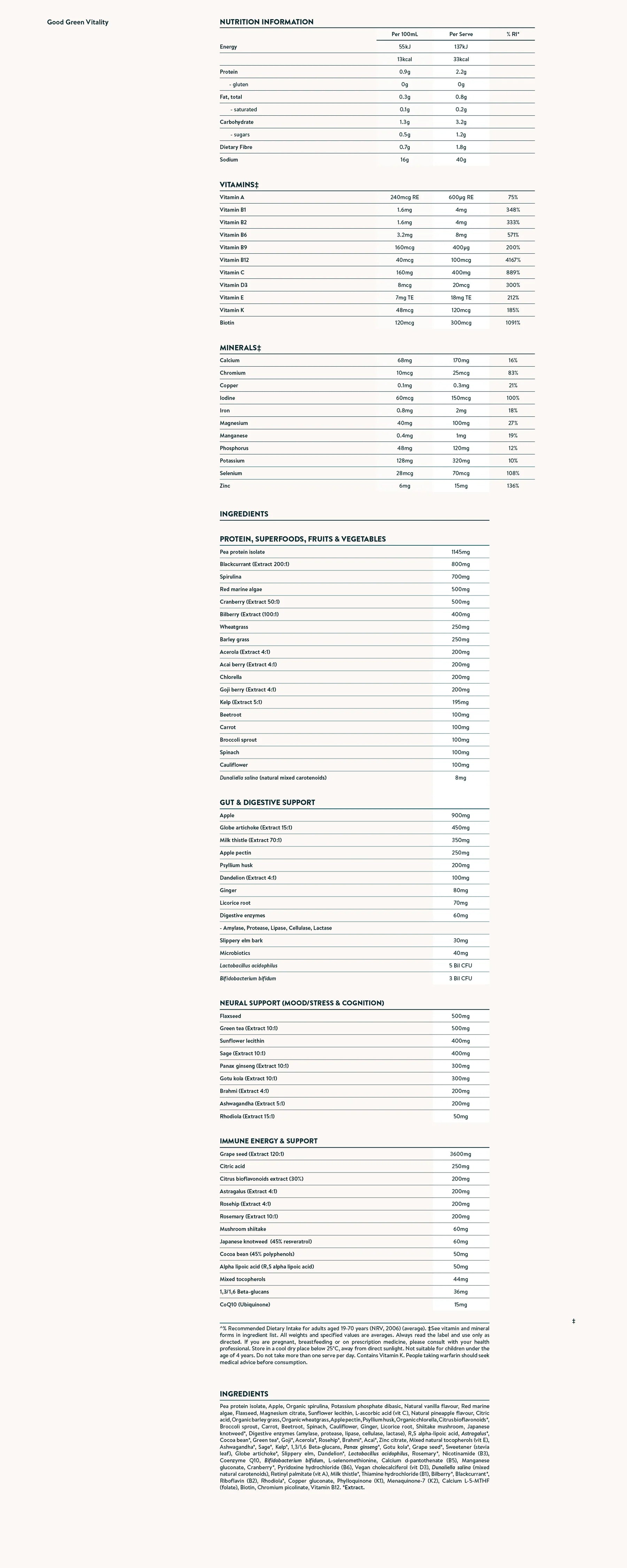 Made with real food, providing all-in-one nutritional support, free from all common allergens and containing absolutely zero bad stuff, Good Green Vitality is naturally good, easy-to-use, incredibly delicious and perfect for all members of the family.